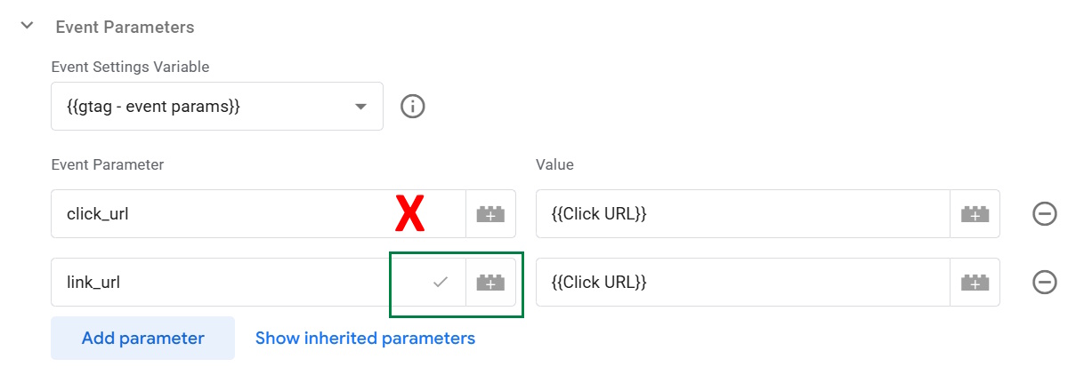 Similarly, if you want to track URLs or text from clicked links, instead of creating a custom dimension like “Click Name,” it’s better to use the existing link_url or link_text parameters. As you can see in the screenshot below, there is a checkbox showing that the link_url parameter is identified by the GA4 Tag.