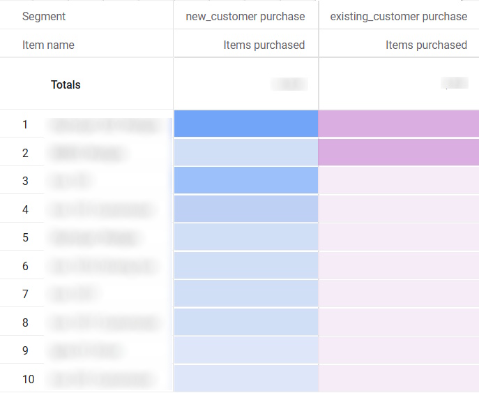 Google Analytics 4 ecommerce items purchased by new and existing (returning) customers