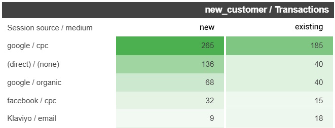 Google Analytics 4 ecommerce Transactions by new and existing (returning) customers and Session source / medium