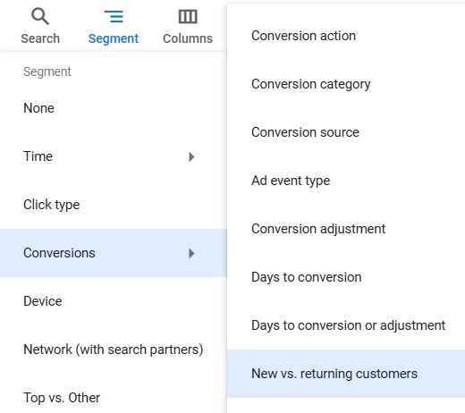 Enable new vs. returning customers conversion segmentation. Select this Segment in Google Ads: